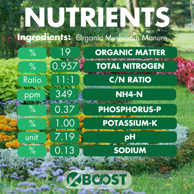 Enhance your soil with K-BOOST Mushroom Manure. Sourced from an organically certified farm, this mushroom compost greatly increases microbial activity, reduces the need for watering and contains excessive amounts of nutrients reducing the need for artificial fertilizers. Our Mushroom Compost amends clay soils by reducing soil capping, increases the soil’s natural porosity, increases nutrient retention therefore reducing plant stress.