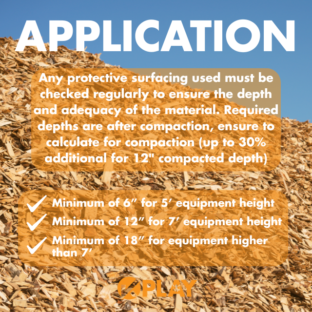 Any protective surfacing used must be checked regularly to ensure the depth and adequacy of the material. Required depths are after compaction, ensure to calculate for compaction (up to 30% additional for 12″ compacted depth)