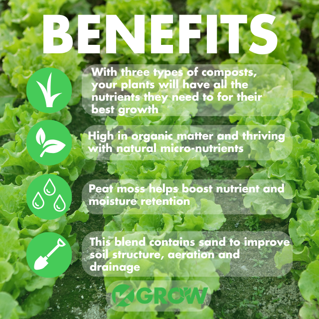 With three types of compost, your plants receive a balanced, organic diet that fuels growth from root to bloom. Rich in organic matter and naturally moisture-retentive, K-Grow is your go-to for healthier plants, bigger harvests, and beautiful blossoms.