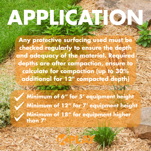 Any protective surfacing used must be checked regularly to ensure the depth and adequacy of the material. Required depths are after compaction, ensure to calculate for compaction (up to 30% additional for 12″ compacted depth).